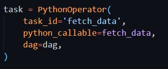 The default argument is assigned with args which contains owner as airflow and start date. Also the DAG is schedule of running once for every 10 hours and start from current date. PythonOperator is used with the taskid fetchdata. The function fetchdata is called